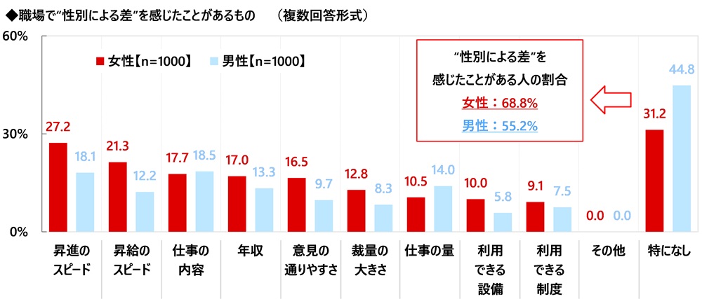 男性(1,000名)と比較すると、“性別による差”を感じたことがある人の割合は、男性(55.2%)と比べて女性(68.8%)のほうが10ポイント以上高くなりました。また、「昇進のスピード」(女性27.2%、男性18.1%)、「昇給のスピード」(女性21.3%、男性12.2%)では男性より女性のほうが5ポイント以上高くなりました。