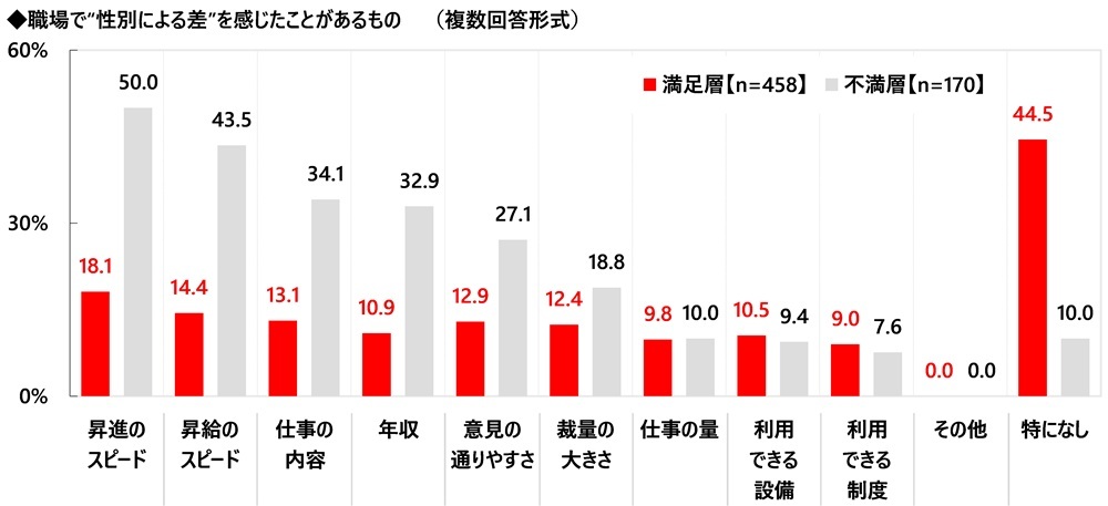 職場の性差の状況に対する満足度別にみると、満足層では「昇進のスピード」(18.1%)、「昇給のスピード」(14.4%)、「年収」(10.9%)が全体(順に27.2%、21.3%、17.0%)と比べて5ポイント以上低くなりました。また、「特になし」(44.5%)の割合が最も高く、4割を上回りました。一方で、不満層についてみると、「昇進のスピード」(50.0%)が半数となりました。