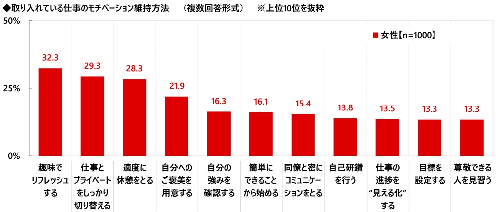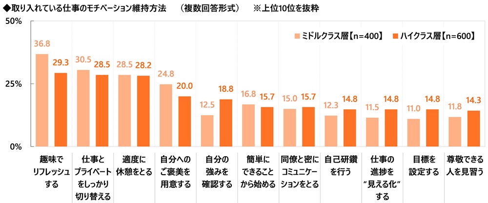 ミドル・ハイクラス女性(1,000名)に、取り入れている仕事のモチベーション維持方法を聞いたところ、「趣味でリフレッシュする」(32.3%)が最も高くなり、「仕事とプライベートをしっかり切り替える」(29.3%)、「適度に休憩をとる」(28.3%)、「自分へのご褒美を用意する」(21.9%)と続きました。仕事と私生活のちょうどよいバランスをとることでモチベーションを維持しているという女性が少なくないようです。そのほか、「自分の強みを確認する」(16.3%)や「同僚と密にコミュニケーションをとる」(15.4%)は6人に1人と、“内省”や“対話”を通じてモチベーションを保ったり気持ちを前向きにしたりしている人もみられました。