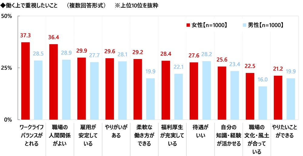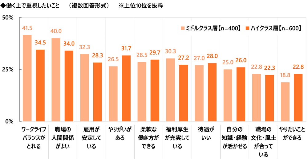 はじめに、ミドル・ハイクラス女性(1,000名)に、働く上で重視したいことを聞いたところ、「ワークライフバランスがとれる」(37.3%)が最も高くなり、「職場の人間関係がよい」(36.4%)、「雇用が安定している」(29.9%)、「やりがいがある」(29.6%)、「柔軟な働き方ができる」(29.2%)が続きました。