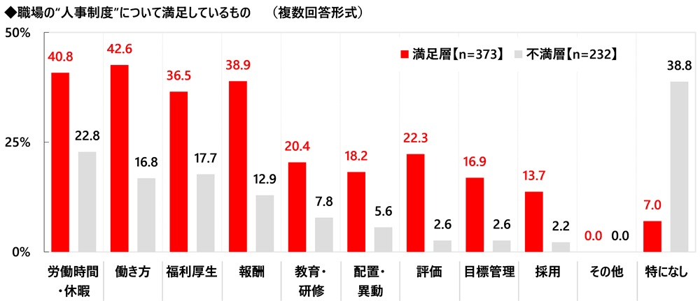 職場の人事制度に対する満足度別にみると、満足層では「労働時間・休暇」(40.8%)、「働き方」(42.6%)、「福利厚生」(36.5%)、「報酬」(38.9%)に回答が集中しました。ワークライフバランスの実現と十分な報酬の両立が、人事制度に対する満足感を高める要因となるのではないでしょうか。また、「働き方」(満足層42.6%、不満層16.8%)、「報酬」(満足層38.9%、不満層12.9%)では満足層が不満層を25ポイント以上上回りました。