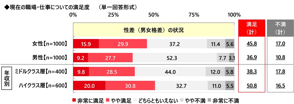 年収別にみると、『満足(計)』の割合はミドルクラス女性では29.5%と、3割未満にとどまった一方、ハイクラス女性では42.5%となりました。