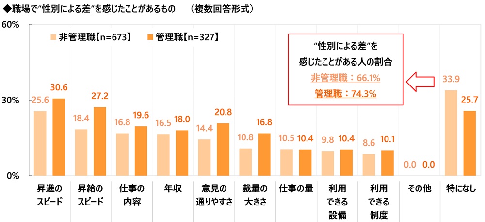 「職場で性別による差を感じたことがある」 非管理職では6割半、管理職では7割半