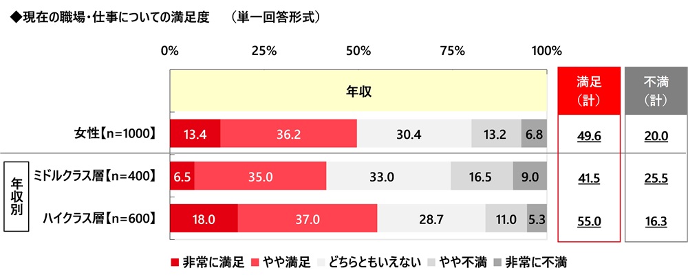 年収別にみると、『満足(計)』の割合はハイクラス女性(55.0%)がミドルクラス女性(41.5%)と比べて10ポイント以上高くなりました。
