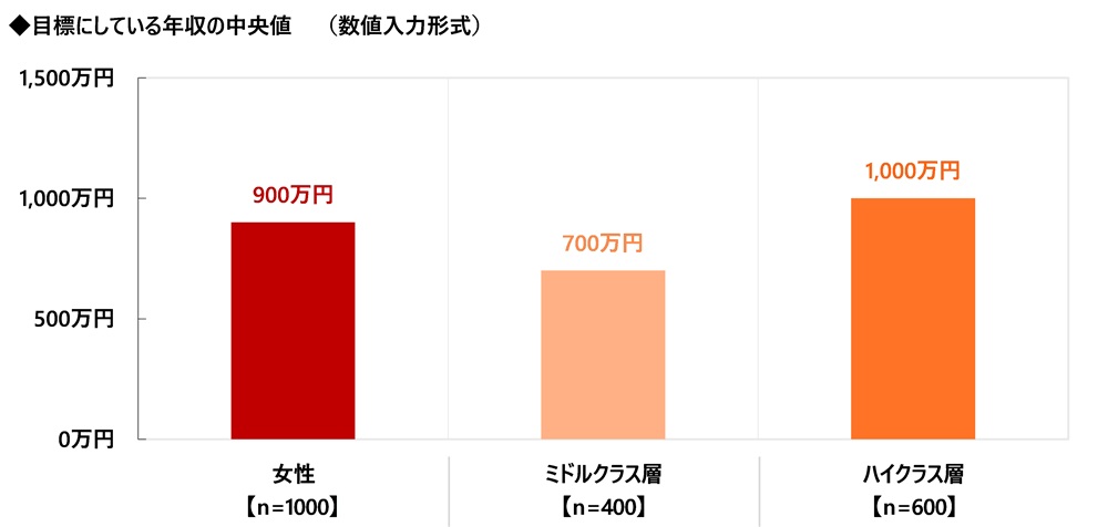 年収別にみると、目標にしている年収の中央値は、ハイクラス女性では1,000万円、ミドルクラス女性では700万円となりました。