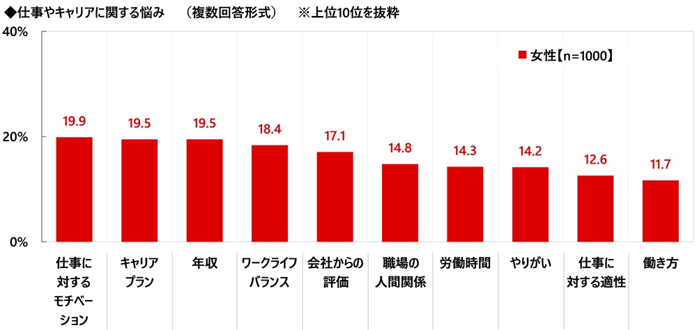 仕事やキャリアに関する悩みを聞いたところ、「仕事に対するモチベーション」(19.9%)が最も高くなり、「キャリアプラン」「年収」(いずれも19.5%)、「ワークライフバランス」(18.4%)、「会社からの評価」(17.1%)が続きました。