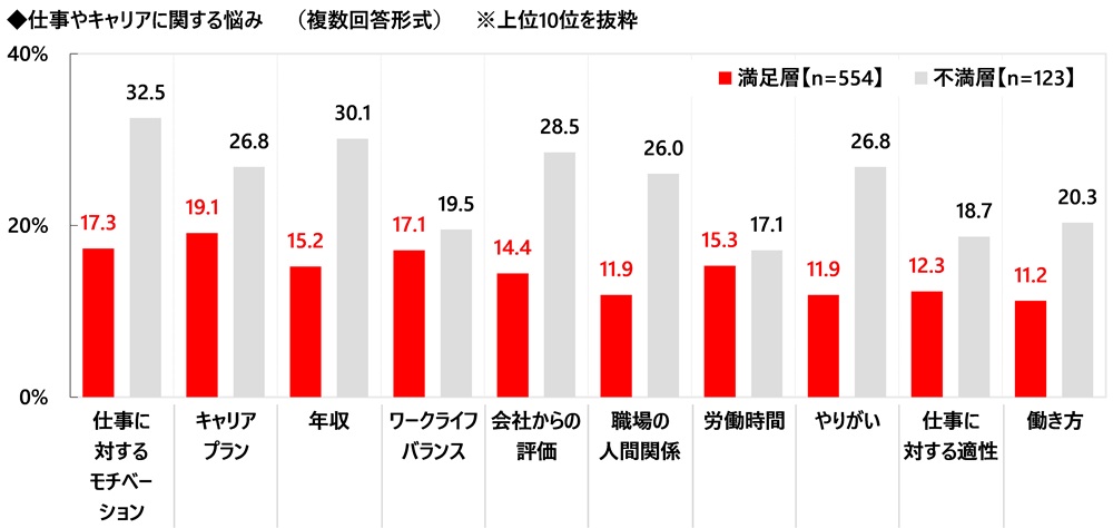 今の仕事・キャリアについての総合満足度別にみると、不満層では「仕事に対するモチベーション」(32.5%)、「年収」(30.1%)が3割を上回りました。報酬が不十分だという実感が、モチベーションの低下につながっていることが考えられます。