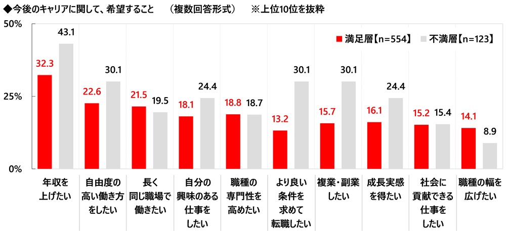 今の仕事・キャリアについての総合満足度別にみると、不満層では「年収を上げたい」(43.1%)、「より良い条件を求めて転職したい」「複業・副業したい」(いずれも30.1%)が満足層(順に32.3%、13.2%、15.7%)と比べて10ポイント以上高くなりました。不満層には、その不満の解消を現在の仕事ではなく、別の仕事に求めている人が少なくないようです。