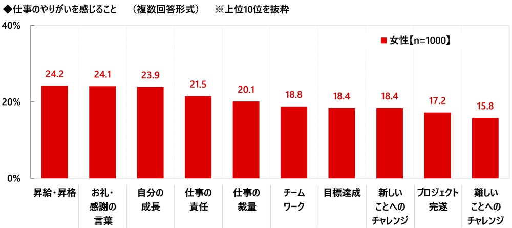 ミドル・ハイクラス女性(1,000名)に、どのようなことに“仕事のやりがい”を感じるか聞いたところ、「昇給・昇格」(24.2%)が最も高くなり、次いで「お礼・感謝の言葉」(24.1%)、「自分の成長」(23.9%)、「仕事の責任」(21.5%)、「仕事の裁量」(20.1%)となりました。自身の仕事への評価が実感できたときにやりがいを感じる人が多いようです。