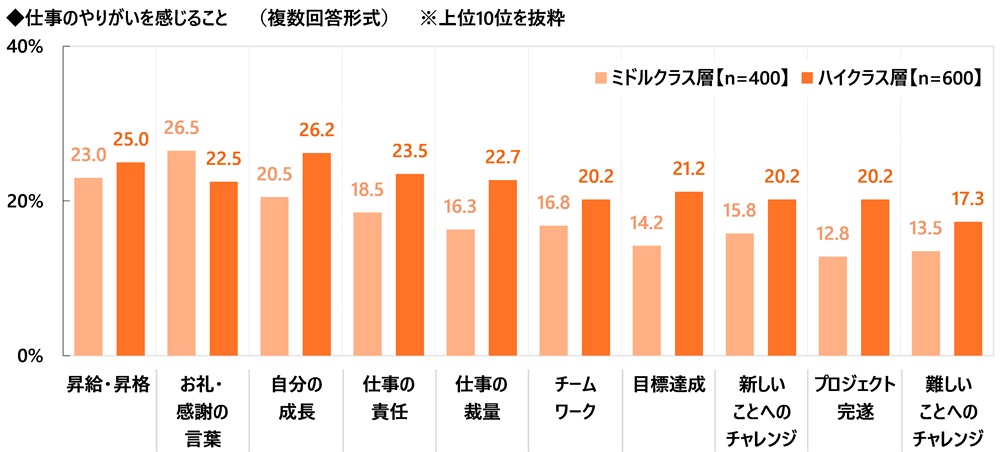 年収別にみると、ミドルクラス女性では1位「お礼・感謝の言葉」(26.5%)、2位「昇給・昇格」(23.0%)、3位「自分の成長」(20.5%)となった一方で、ハイクラス女性では1位「自分の成長」(26.2%)、2位「昇給・昇格」(25.0%)、3位「仕事の責任」(23.5%)となりました。