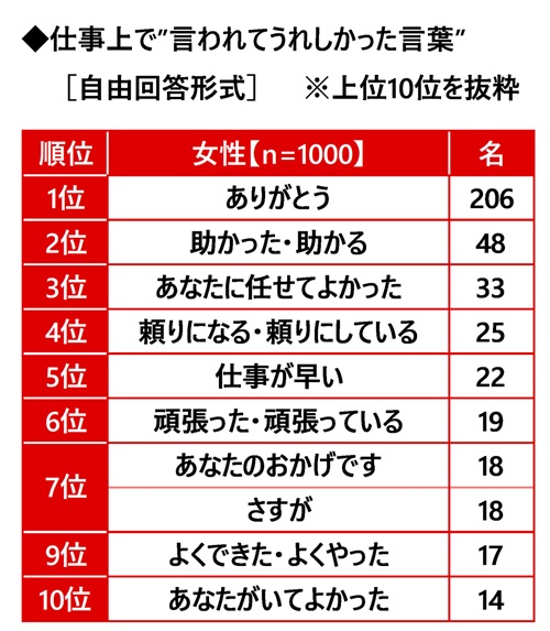 「ありがとう」がダントツ、2位「助かった・助かる」3位「あなたに任せてよかった」