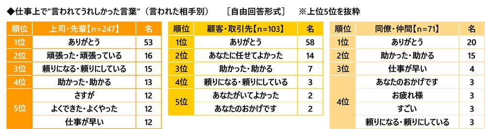 言われた相手別に回答をみると、上司・先輩から言われた言葉では、1位「ありがとう」(53名)、2位「頑張った・頑張っている」(16名)、3位「頼りになる・頼りにしている」(15名)と、頑張りを認める言葉や信頼感を示す言葉が上位となりました。顧客・取引先から言われた言葉では、1位「ありがとう」(58名)、2位「あなたに任せてよかった」(14名)、3位「助かった・助かる」(7名)と、仕事ぶりに満足してもらえたことを実感できる言葉が上位でした。同僚・仲間から言われた言葉では、1位「ありがとう」(20名)、2位「助かった・助かる」(15名)、3位「仕事が早い」(4名)となりました。