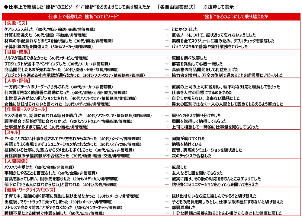 “挫折”をどのようにして乗り越えたかの回答をみると、「材料の手配漏れなどのミスを繰り返した」→「業務を全てスケジュールに組み込み、ダブルチェックを徹底した」など改善策を講じたり、「英語でうまく表現できずコミュニケーションがとれなかった」→「勉強を続けている」など地道な努力をしたり、「事細かにやることを否定された」→「友人などに話を聞いてもらった」など周囲の人に相談したり、「子育て中、融通のきく部署に異動し抜け出せなかった」→「抜け出せないなら逆に楽しんでやろうと切り替えた」など気持ちを切り替えたりしたケースがみられました。