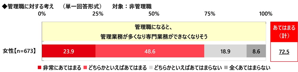 非管理職(673名)に、管理職に対する考えについてどのくらいあてはまるか聞いたところ、≪管理職になると、管理業務が多くなり専門業務ができなくなりそう≫では、「非常にあてはまる」が23.9%、「どちらかといえばあてはまる」が48.6%で、合計した『あてはまる(計)』は72.5%でした。多くの人が、管理職になった場合に専門の業務を行うことが難しくなるのではないかと感じているようです。