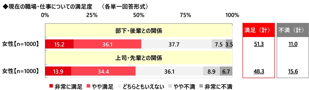 職場での人間関係に対する満足度 「部下・後輩との関係」、「上司・先輩との関係」ともに5割前後