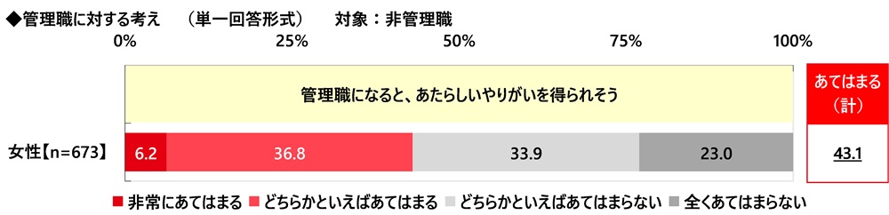 ≪管理職になると、あたらしいやりがいを得られそう≫では、『あてはまる(計)』は43.1%で、半数未満にとどまりました。