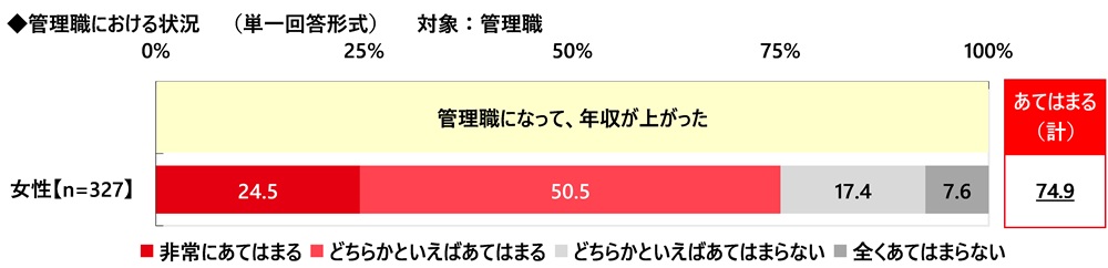 管理職の実際の状況について、≪管理職になって、年収が上がった≫では『あてはまる(計)』は74.9%と、7割半となりました。