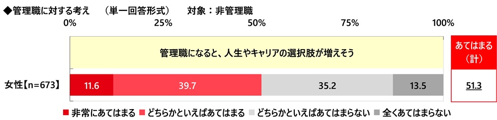 非管理職の管理職に対する考えについて、≪管理職になると、人生やキャリアの選択肢が増えそう≫では『あてはまる(計)』は51.3%でした。