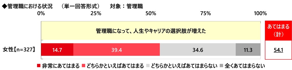 管理職の実際の状況について、≪管理職になって、人生やキャリアの選択肢が増えた≫では『あてはまる(計)』は54.1%でした。