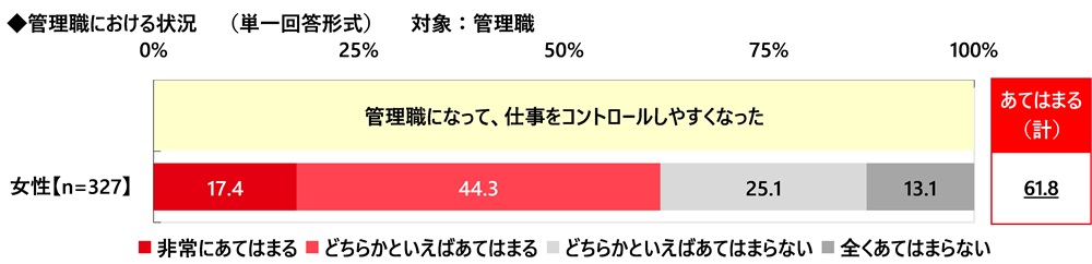 管理職の実際の状況について、≪管理職になって、仕事をコントロールしやすくなった≫では、『あてはまる(計)』は61.8%となり、実際には6割以上の管理職が仕事をコントロールしやすくなったと感じていることがわかりました。
