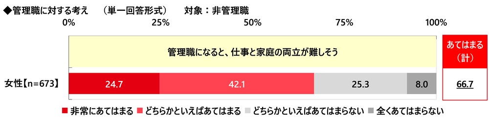 非管理職の管理職に対する考えについて、≪管理職になると、仕事と家庭の両立が難しそう≫では、『あてはまる(計)』は66.7%となりました。