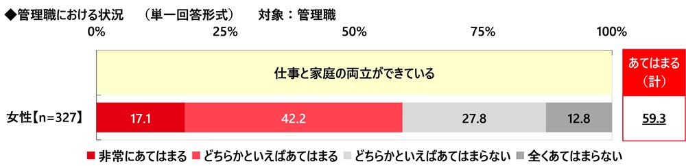 管理職の実際の状況について、≪仕事と家庭の両立ができている≫では、『あてはまる(計)』は59.3%で、実際には、仕事と家庭の両立ができていると感じている人が約6割という結果になりました。
