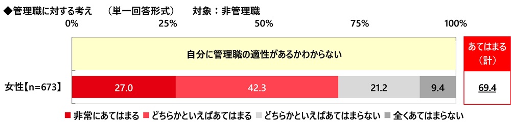 非管理職の管理職に対する考えについて、≪自分に管理職の適性があるかわからない≫では、『あてはまる(計)』は69.4%となりました。