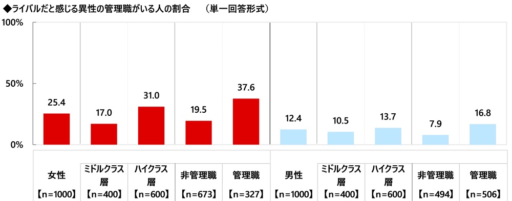「ライバルだと感じる異性の管理職がいる」 ミドル・ハイクラス女性の2割半