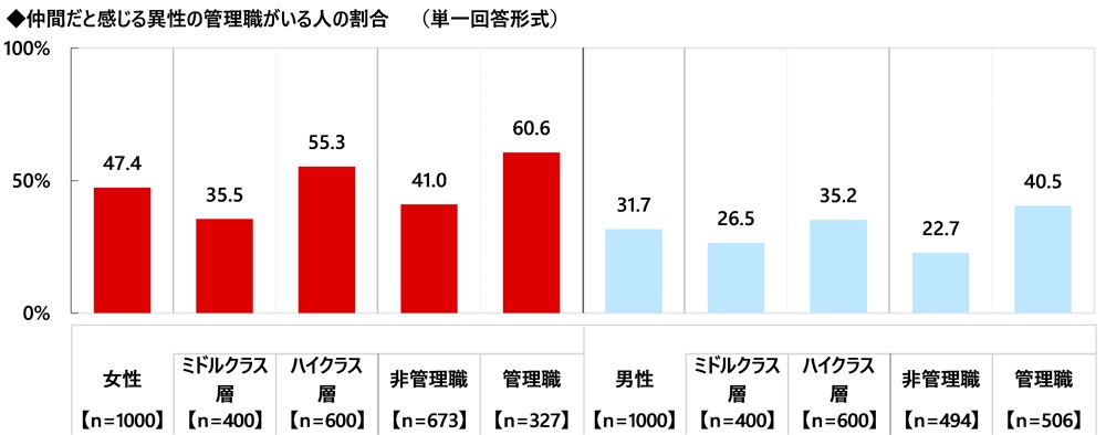 「仲間だと感じる異性の管理職がいる」 ハイクラス女性の5割半、管理職女性では6割