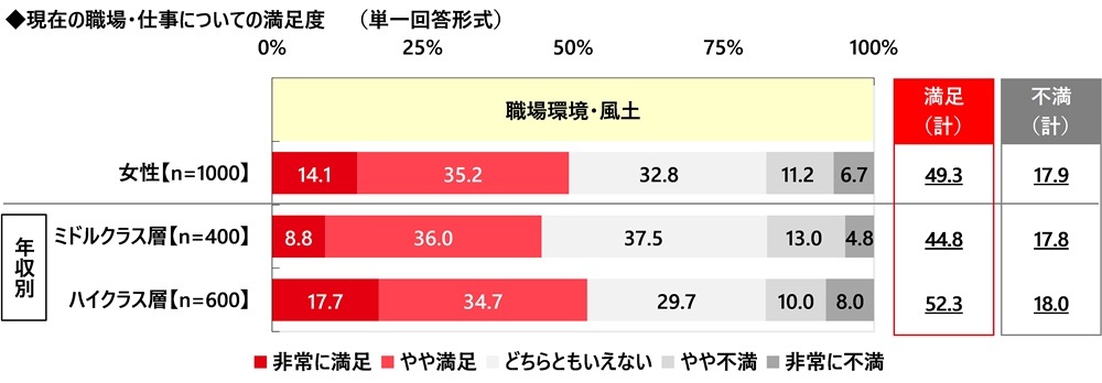 「職場環境・風土」に対する満足度 ミドル・ハイクラス女性の5割