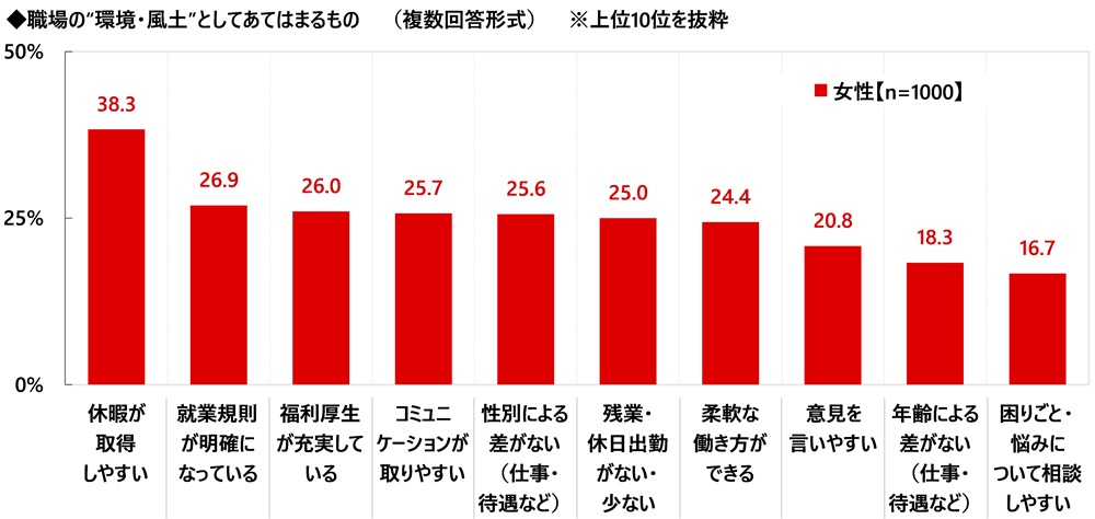 自身の職場の“環境・風土”としてあてはまるものを聞いたところ、「休暇が取得しやすい」(38.3%)が最も高くなり、「就業規則が明確になっている」(26.9%)、「福利厚生が充実している」(26.0%)、「コミュニケーションが取りやすい」(25.7%)、「性別による差がない(仕事・待遇など)」(25.6%)が続きました。