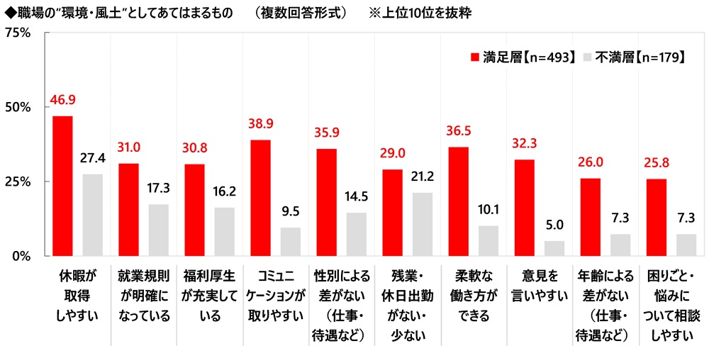職場の環境・風土に対する満足度別にみると、職場の環境・風土に対して満足と感じている満足層では「休暇が取得しやすい」(46.9%)が特に高くなり、「コミュニケーションが取りやすい」(38.9%)、「柔軟な働き方ができる」(36.5%)と続きました。職場の環境・風土に対する満足感はワークライフバランスが実現できる環境で高くなるようです。職場の環境・風土に対して不満と感じている不満層では「コミュニケーションが取りやすい」(9.5%)、「性別による差がない(仕事・待遇など)」(14.5%)、「柔軟な働き方ができる」(10.1%)、「意見を言いやすい」(5.0%)が満足と感じている人(順に38.9%、35.9%、36.5%、32.3%)と比べて20ポイント以上低くなりました。職場の環境・風土に対して不満を感じている人では、職場に対して風通しの良さを感じている人が少ないようです。