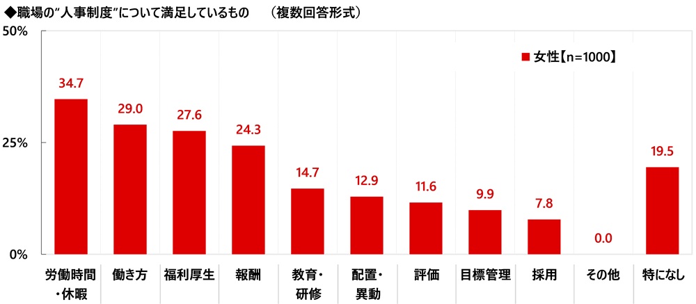 職場の“人事制度”について満足しているものを聞いたところ、「労働時間・休暇」(34.7%)が最も高く、続けて、「働き方」(29.0%)、「福利厚生」(27.6%)、「報酬」(24.3%)、「教育・研修」(14.7%)となりました。