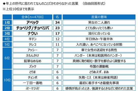 年上の世代に言われてなんのことだかわからなかった言葉 1位「アベック」、2位「チョベリグ/チョベリバ」、3位「ナウい」