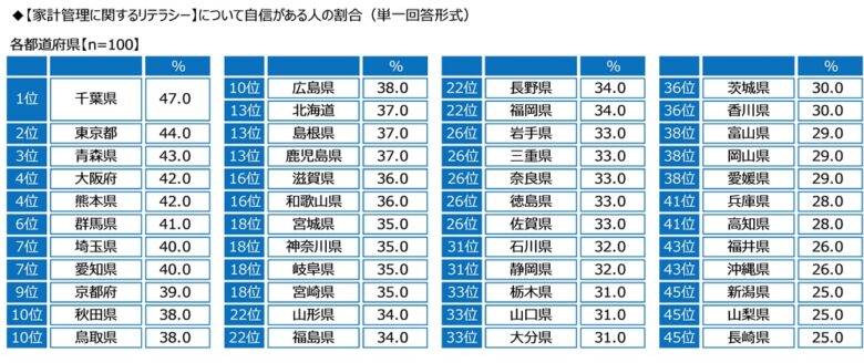 都道府県別にみると、【家計管理に関するリテラシー】では、自信がある人の割合が最も高くなったのは千葉県(47.0%)で、東京都(44.0%)、青森県(43.0%)、大阪府と熊本県(いずれも42.0%)が続きました。最も低くなったのは新潟県、山梨県、長崎県(いずれも25.0%)でした。