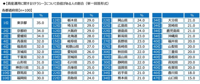 【資産運用に関するリテラシー】では、自信がある人の割合が最も高くなったのは東京都(35.0%)、京都府と愛媛県(いずれも34.0%)、青森県、福島県、茨城県、千葉県(いずれも32.0%)の順となりました。最も低くなったのは山口県(15.0%)で、自信がある人の割合は2割未満にとどまりました。