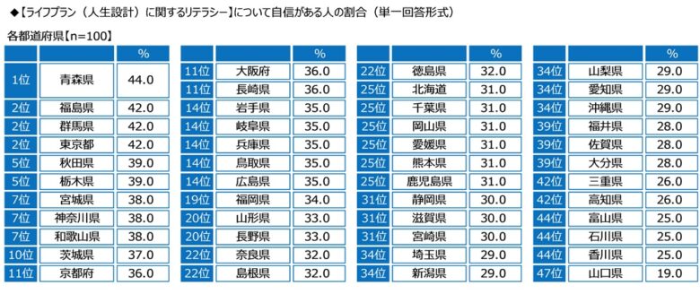 【ライフプラン(人生設計)に関するリテラシー】では、自信がある人の割合が最も高くなったのは青森県(44.0%)となり、福島県、群馬県、東京都(いずれも42.0%)、秋田県と栃木県(いずれも39.0%)が続きました。自信がある人の割合が最も低くなったのは【資産運用に関するリテラシー】と同様に山口県(19.0%)で、ライフプランについても2割を下回りました。