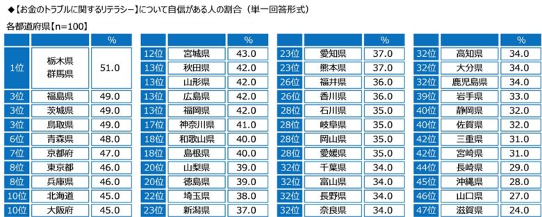 【お金のトラブルに関するリテラシー】では、自信がある人の割合が最も高くなったのは栃木県と群馬県(いずれも51.0%)で、自信がある人が半数以上いるという結果になりました。以降、福島県、茨城県、鳥取県(いずれも49.0%)が続きました。また、最も低くなったのは滋賀県(24.0%)でした。