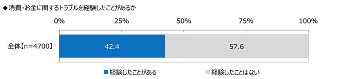 全回答者(4,700名)に、消費・お金に関するトラブルを経験したことがあるか聞いたところ、「経験したことがある」は42.4%、「経験したことはない」は57.6%となりました。