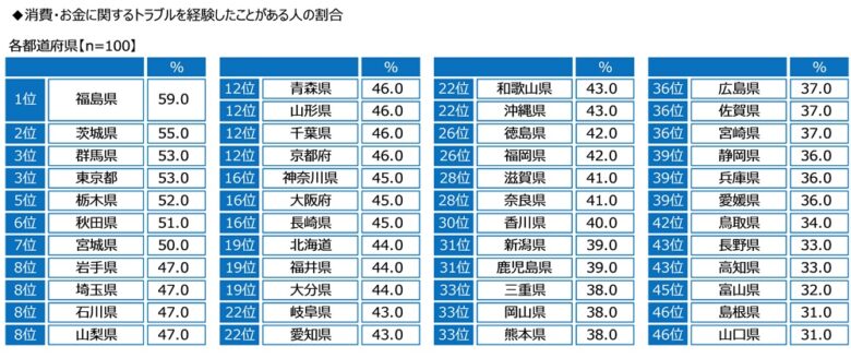 都道府県別にみると、消費・お金に関するトラブルの経験率が最も高くなったのは、福島県(59.0%)で、次いで茨城県(55.0%)、群馬県と東京都(いずれも53.0%)、栃木県(52.0%)となりました。【お金のトラブルに関するリテラシー】に対する自信度が51.0%で1位となった群馬県が経験率では3位、同じく自信度1位の栃木県が経験率5位、49.0%で自信度3位となった福島県が経験率では1位、同じく自信度3位の茨城県が経験率では2位となり、お金のトラブルに関するリテラシーへの自信度が高い都道府県が経験率でも上位に入る結果となりました。トラブルを経験したことによってリテラシーを身に着けた20代も多いのかもしれません。