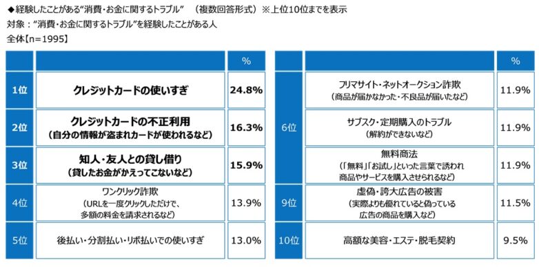 経験したことがある消費・お金に関するトラブル 「クレジットカードの不正利用」「ワンクリック詐欺」も上位に
