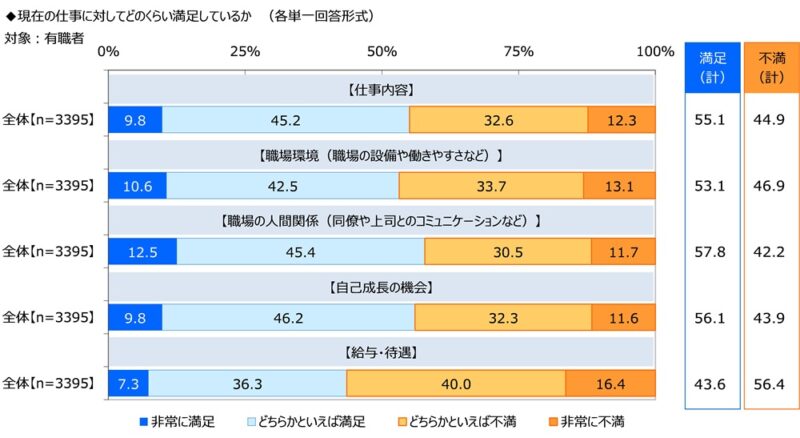 また、【職場環境(職場の設備や働きやすさなど)】では『満足(計)』は53.1%、【職場の人間関係(同僚や上司とのコミュニケーションなど)】では57.8%、【自己成長の機会】では56.1%と、いずれも満足している人が多数派となったのに対し、【給与・待遇】では『満足(計)』は43.6%、『不満(計)』は56.4%と、不満層が満足層を上回る結果となりました。