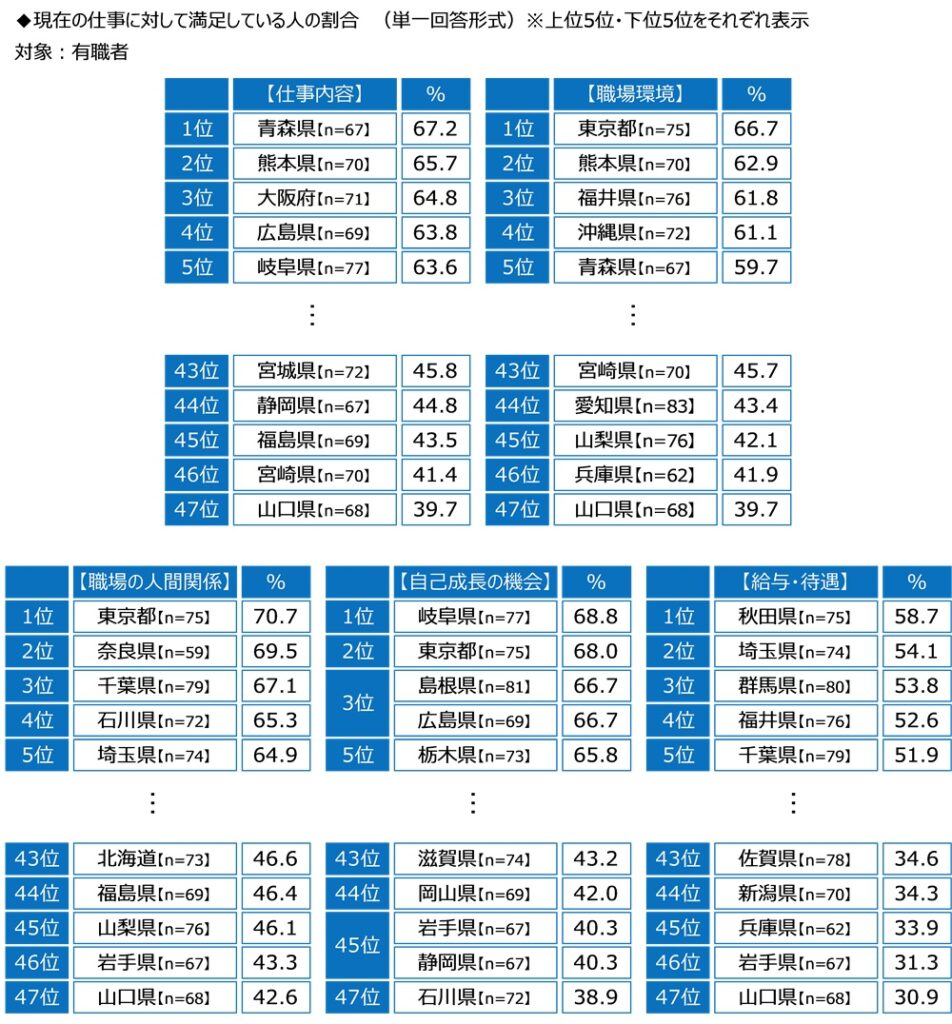 「仕事内容」の満足度1位は青森県、「職場環境」と「職場の人間関係」の満足度1位は東京都、