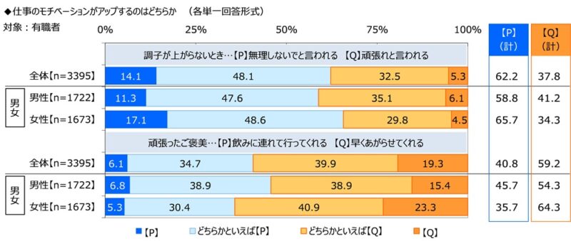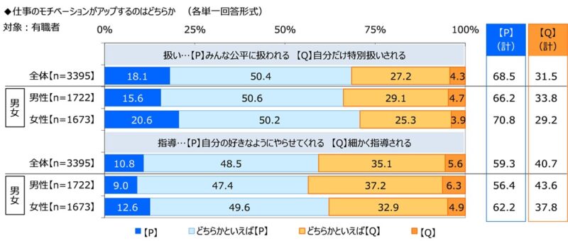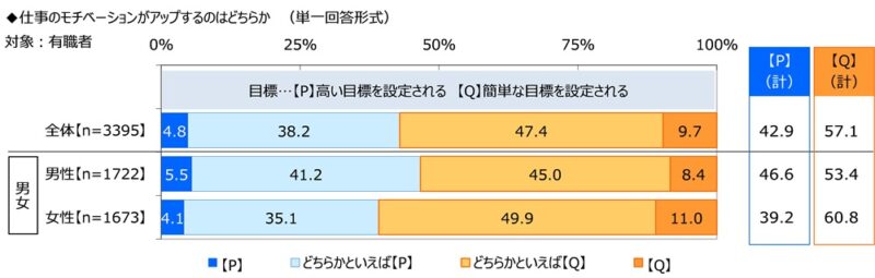 有職者(3,395名)に、仕事に関する事柄について2つのケースを提示し、仕事のモチベーションがアップするのはそれぞれどちらか聞いたところ、≪目標≫では『高い目標を設定される(計)』(「【P】」と「どちらかといえば【P】」の合計、以下同様)が42.9%、『簡単な目標を設定される(計)』(「【Q】」と「どちらかといえば【Q】」の合計、以下同様)が57.1%となりました。目標設定においては、達成が難しいような高い目標ではなく、達成が比較的容易な目標に向けて取り組むようにするほうが、モチベーションが上がると感じる人が多いようです。