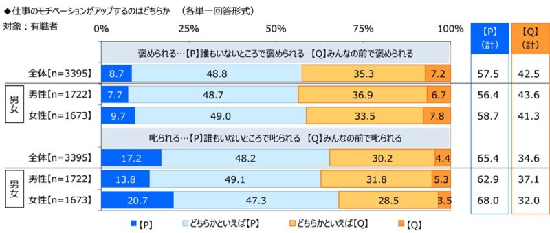 ≪褒められる≫では『誰もいないところで褒められる(計)』が57.5%、『みんなの前で褒められる(計)』が42.5%、≪叱られる≫では『誰もいないところで叱られる(計)』が65.4%、『みんなの前で叱られる(計)』が34.6%と、どちらも“誰もいないところ”のほうが多数派となりました。