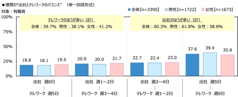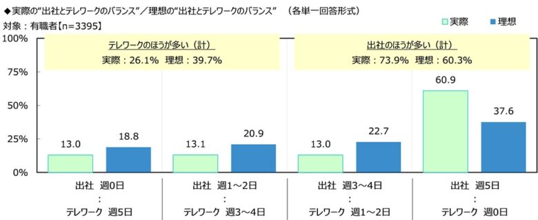 勤務スタイルの理想と現実 理想の“出社とテレワークのバランス”は「出社 週5日:テレワーク 週0日」が最多、
