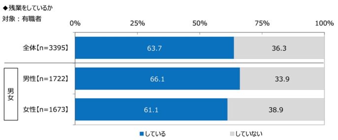 まず、有職者(3,395名)に、残業をしているか聞いたところ、「している」は63.7%、「していない」は36.3%となりました。