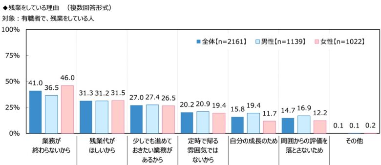 残業をしている理由 1位「業務が終わらない」、2位「残業代がほしい」、3位「少しでも進めておきたい業務がある」