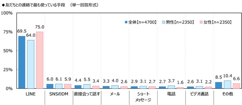 友だちとの連絡で最も使っている手段 「LINE」が70%でダントツ、「SNSのDM」は6%、「直接会って話す」は4%