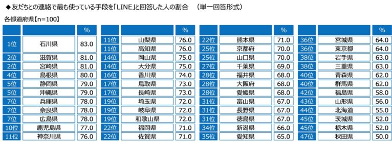 都道府県別にみると、「LINE」と回答した人の割合は石川県(83.0%)が最も高くなり、滋賀県と宮崎県(いずれも81.0%)が続きました。